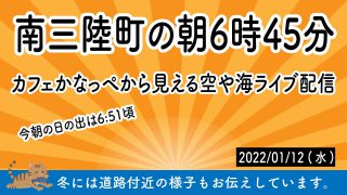 おはようございます。 今朝も6:45より、カフェから見える海や天気の様子をライブ配信します。 南三陸町の朝の様子が気になる方は参考にしてください。