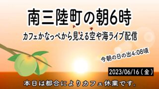 おはようございます。 カフェから見える空や海の様子を朝6時からライブ配信します。 南三陸町の朝の様子が気になる方はご覧ください。 #朝 #南三陸町 #宮城県 #東北 #南三陸町歌津 #オーガニックカフェかなっぺ #カフェ […]