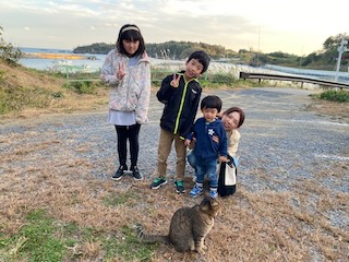 帰ろうとする車の通り道に地域猫たちが集まっていました。