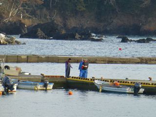 こちらの船で種が挟んであるロープを沖へ運ぶようです。