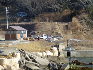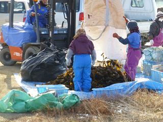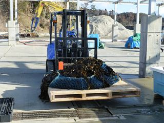 漁港の復旧作業に従事している人達や車両があるため、わかめを陸に上げる作業をスムーズにできないようでした。