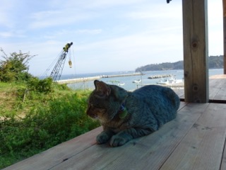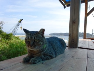 地域猫のキーちゃんがテーブルの上でくつろいでいました。